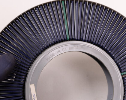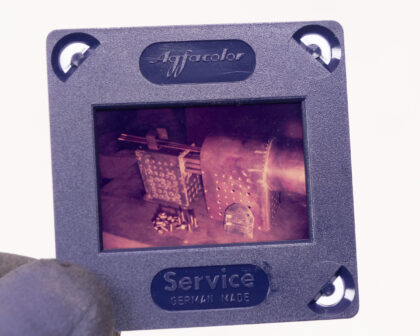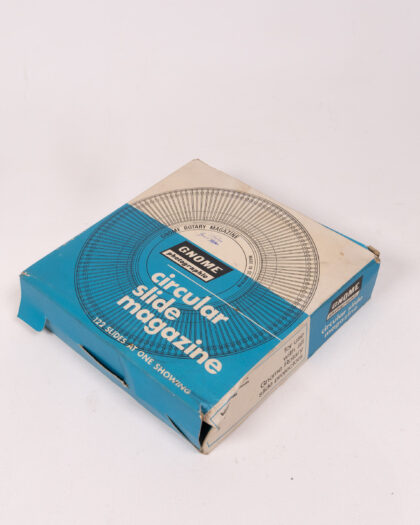 This is a vintage Gnome Photographic circular slide magazine, designed to hold 122 slides. Made in Great Britain. The item is in its original box, which shows signs of age-related wear and tear, including scuffs and fading. This vintage photographic accessory is a collector's item, ideal for enthusiasts of vintage photography equipment. It is designed for use with Gnome Rotary slide projectors. Slides are not included, but one Agfacolor slide is shown. The box graphics give a nice retro feel.