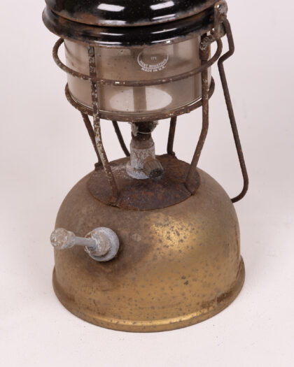 Vintage lantern with a gold coloured base and black top. There is a glass section in the middle, held together by a metal frame. The lantern has a metal handle and a knob on the side. The item shows some signs of wear and tear, with rust and discolouration in places, as shown in the images.