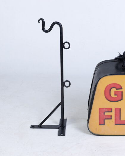 This is a vintage 'Gold Flake' tobacco shop sign, complete with its original hanging bracket. The sign features a black metal frame with a yellow face and bold red lettering. It has some wear and tear consistent with age. The hanging bracket is made of black painted metal and is designed for wall mounting. This is a great piece of tobacciana and a unique addition to any collection.
