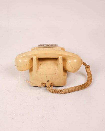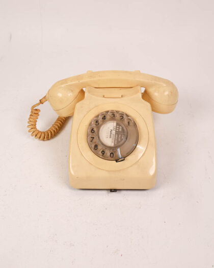 Vintage GPO style rotary telephone. Cream plastic body, dial and handset. The cord is intact. Some age-related discolouration and wear.