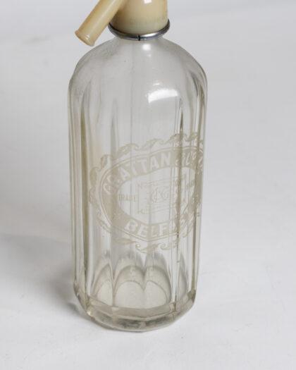 This vintage Grattan & Co. Ltd. Belfast glass seltzer bottle features a stylish ribbed design and an etched logo, giving it a classic look. The bottle is equipped with a siphon top made of metal and plastic, showing signs of wear consistent with age. Ideal for collectors or as a decorative piece.
