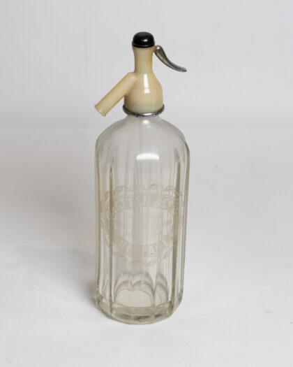 A classic vintage glass seltzer bottle with a metal and plastic siphon top.
