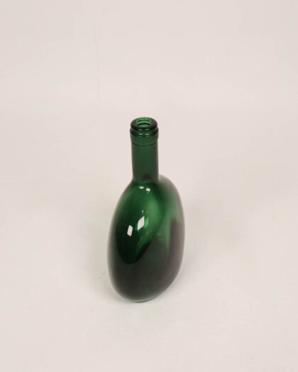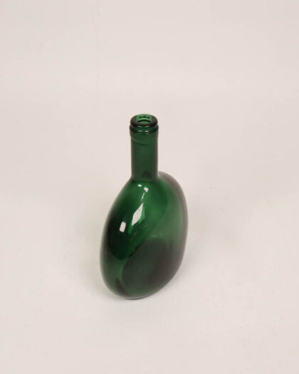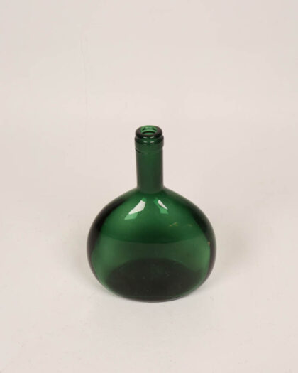 This is a vintage green glass demijohn bottle, featuring a classic round body and a narrow neck. The glass has a vibrant green hue that catches the light beautifully. The bottle has a smooth, rounded form, adding to its decorative appeal.
