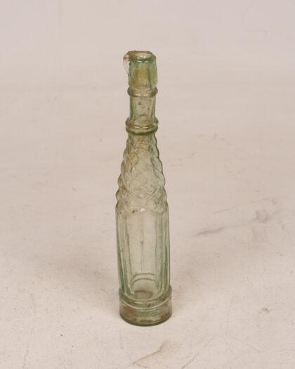 This is a vintage green glass bottle featuring a distinctive swirl design. The bottle is made of clear green glass. Its age is evident from the visible wear, adding to its antique charm. The top of the bottle has a slight mistake from manufacture. It makes a unique decorative item for collectors or those looking to add a touch of vintage flair to their home decor.