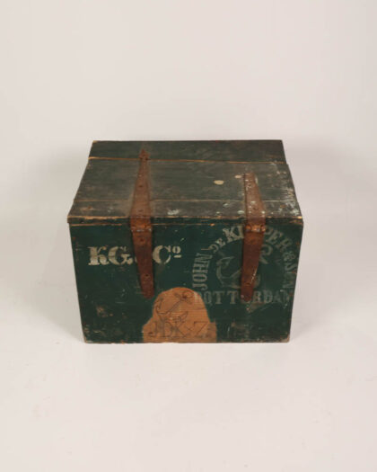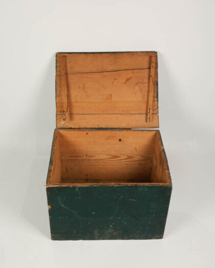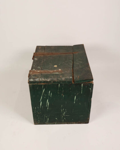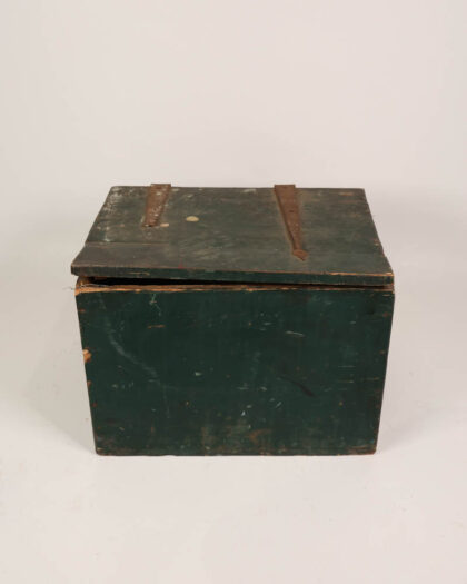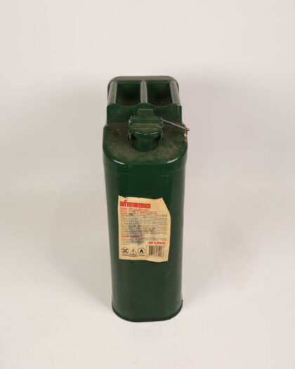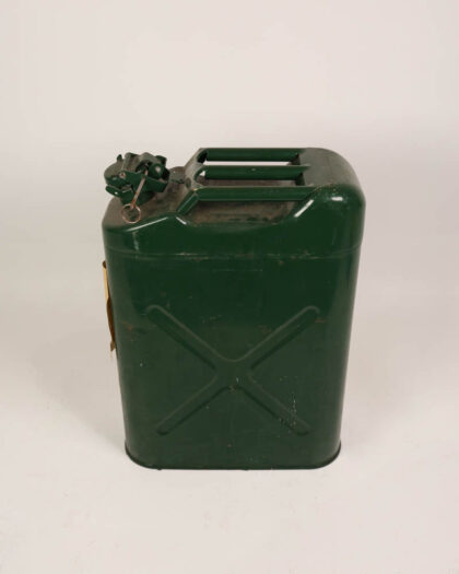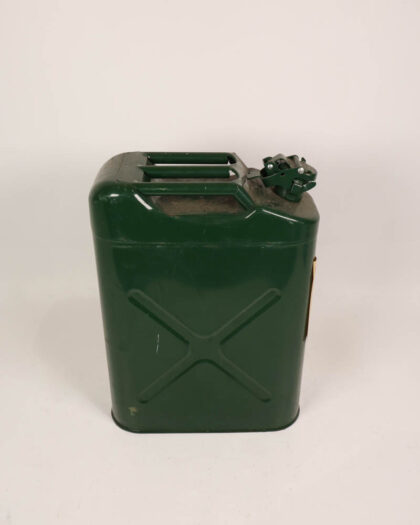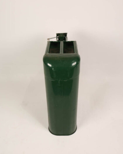 Vintage green metal fuel can featuring a distinctive cross design. In good condition, ready to add a touch of industrial charm to any collection.