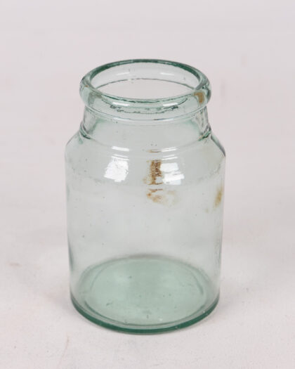 This is a clear glass jar with a slight green tint. It features a simple, cylindrical body with a short, rounded neck. The glass has some minor marks and light wear, adding to its rustic charm. A versatile piece that can be used for floral arrangements or as a decorative accent, it would sit well in any room.