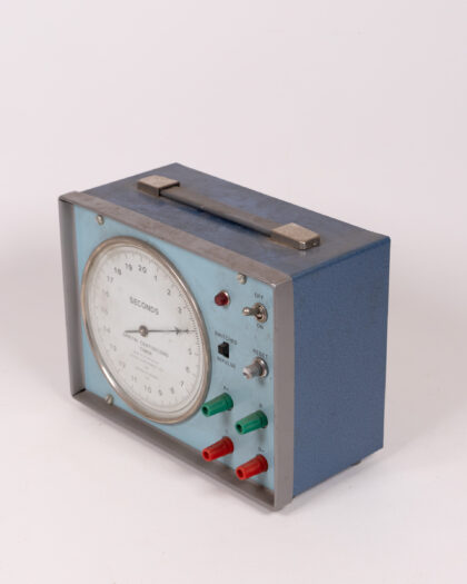 Vintage Griffin & George Centisecond Timer, a scientific instrument used for precise timing in experiments. The timer features a large, clear dial marked in seconds, with additional controls for 'Switched Impulse' and 'Reset'. Housed in a robust metal case with a carry handle for portability. The front panel has terminals labelled A+, B, C, and D+ for connecting to external devices. The back shows the label with instructions. A practical piece of scientific history and a great addition to any collection of vintage scientific equipment. The appliance appears to be in good condition for its age, with some signs of wear and use. Sold as seen. Plug attached, not tested.