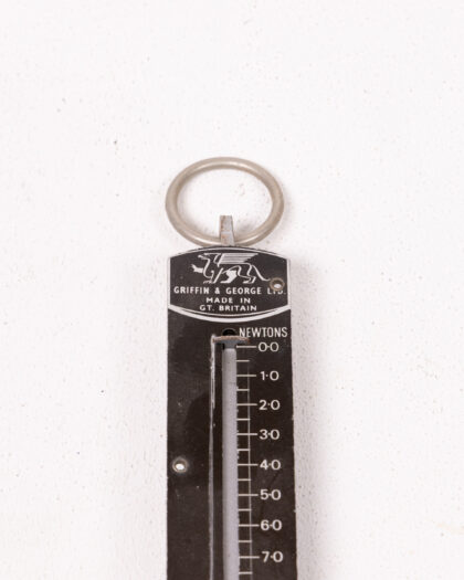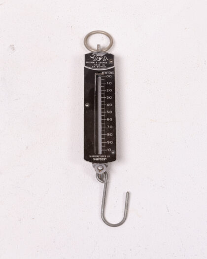 Vintage Griffin & George Ltd Spring Scale, manufactured by Salter in Great Britain. The scale is primarily black with silver/metal accents, including the hook and ring at the top. It measures force in Newtons (N). It would make a quirky addition to a tool collection or a functional display piece.