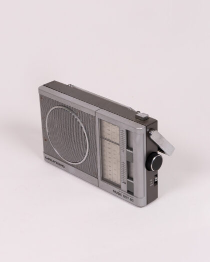 Vintage Grundig Music Boy 60 AM/FM Portable Radio. The radio has a silver front with a round speaker grill on the left. The Grundig logo is in the lower left corner. To the right of the speaker are the radio frequency indicators. Along the right side are the tuning controls. The radio is grey on the top, bottom, and sides, with a telescoping antenna on the top. The back has the battery information. The radio shows some signs of age.