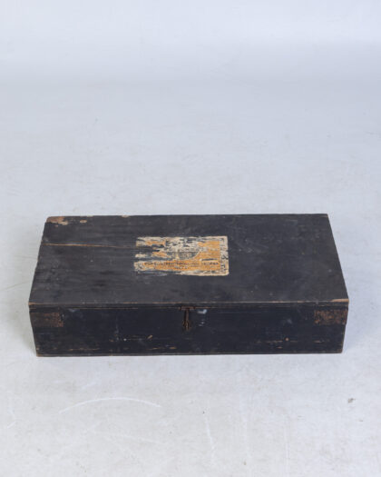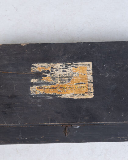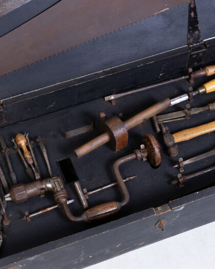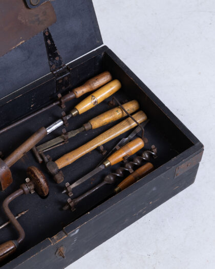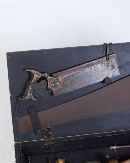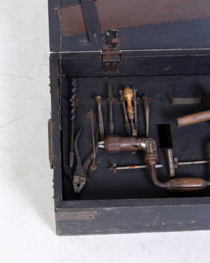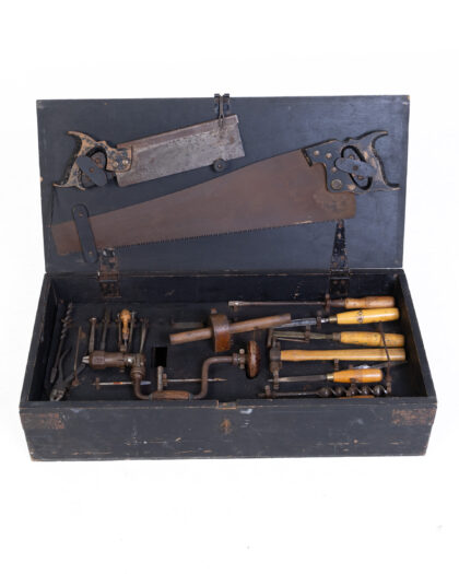Vintage toolbox complete with an array of tools. The box itself is wooden with a dark finish and shows signs of wear consistent with age and use. Inside, the tools vary from saws and drills to chisels and wrenches, each bearing the marks of time. This item is a mix of functionality and nostalgia. There is visible wear and tear on both the box and the tools, contributing to its antique charm. A perfect addition to a collection or as a decorative piece for those appreciating vintage craftsmanship.