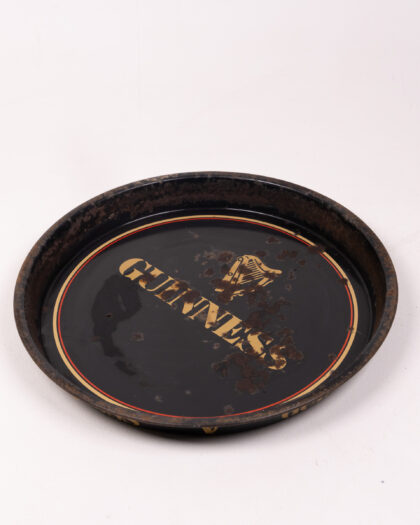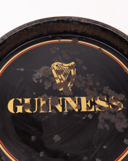 Vintage Guinness metal drinks tray, featuring the iconic logo. Shows wear and tear, adding character. A unique home bar accessory.