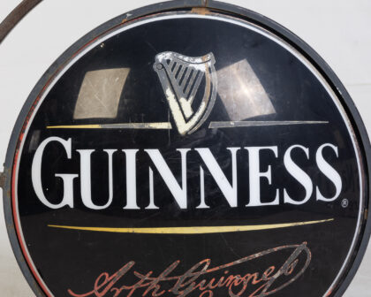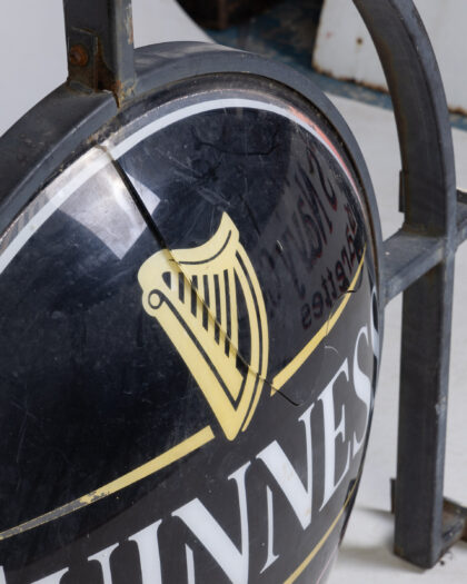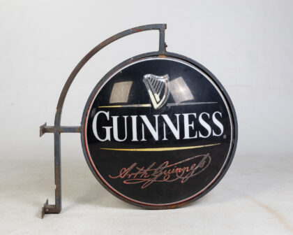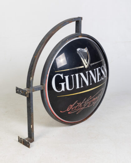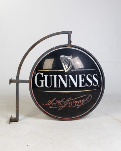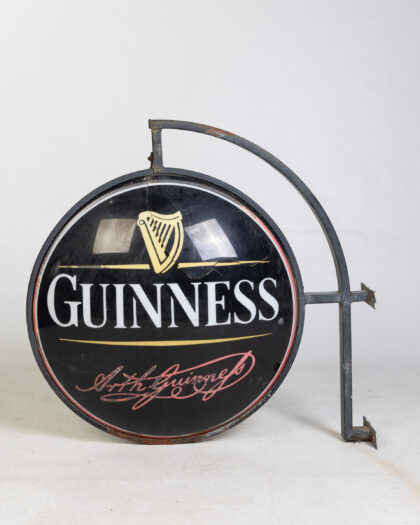 Vintage Guinness pub sign with metal hanging frame. Iconic harp logo and Arthur Guinness signature. Shows signs of age, untested.