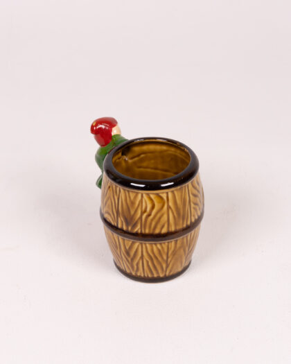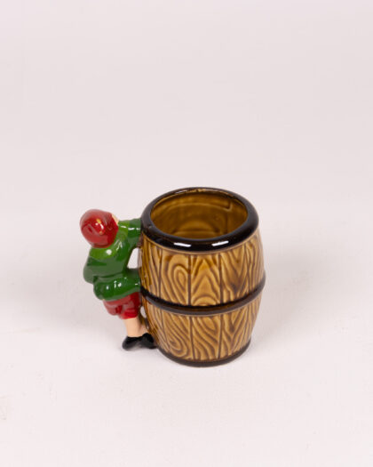 Vintage Guinness stoneware barrel mug featuring a leprechaun handle. A unique collectible for Guinness enthusiasts and home bars.