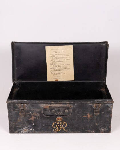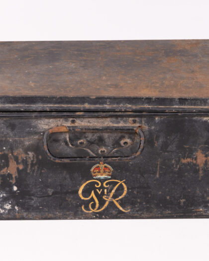 This is a vintage metal trunk, likely dating to the early to mid-20th century. It is constructed of black painted metal with brass or gold coloured detailing. The front of the trunk features a decorative 'GVI R' monogram and crown emblem. It has a hinged lid and metal carry handles on either side. The trunk shows considerable wear and age, with rust and paint chipping throughout, but this adds to its vintage charm. Inside there is a small stack of old medical sheets. This trunk could be used for storage or as a decorative piece.