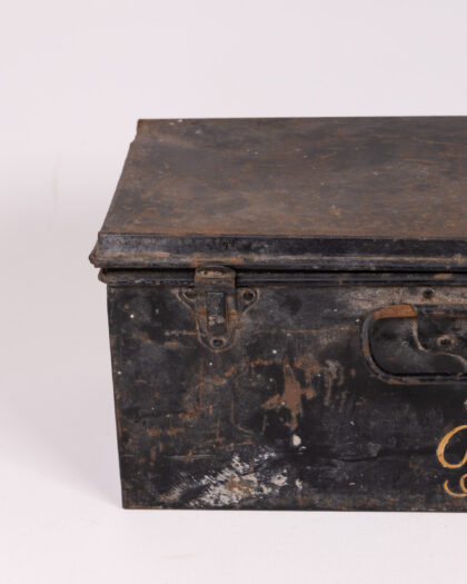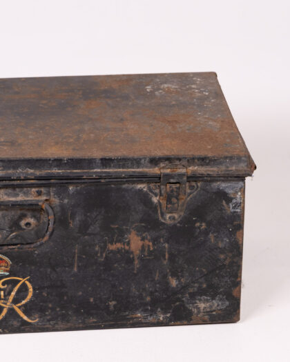Vintage black metal trunk, featuring the GVI R emblem. Distressed finish adds to the unique character. Storage or décor! Read description