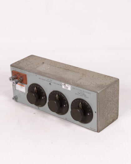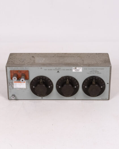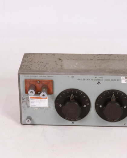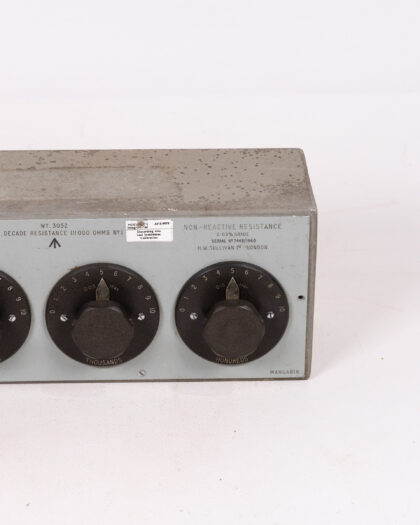 The vintage H.W. Sullivan Ltd. Decade Resistance Box is a precision instrument designed for electrical measurement and experimentation. Marked "Non-Reactive Resistance", this unit features a gray metal casing, three rotary dials for adjusting resistance levels (tens, hundreds, thousands), and clearly labeled terminals. The label "Residual Resistance 0.005 Ohm (Nominal)" indicates its accuracy. The build quality is robust, with each component carefully assembled, though the casing shows signs of age and wear, which add to its authentic vintage appeal. This resistance box would be ideal for collectors of vintage scientific equipment or for educational demonstrations in physics and electrical engineering. The unit displays a sticker with information about calibration and is marked H.W. Sullivan of London.
