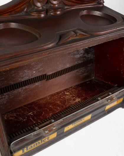 The cabinet has a dark brown finish with yellow lettering. The wood grain is visible throughout. The acrylic door shows some wear. There is cosmetic wear to the wooden areas.