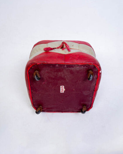 Vintage leather pouffe, red and grey patchwork style. Hamley's label on base with castor wheels. Wear to leather as shown.