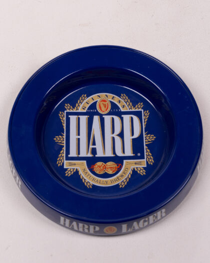 Vintage Harp Lager melamine ashtray featuring the Harp Lager logo in white and gold. Some surface wear.