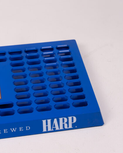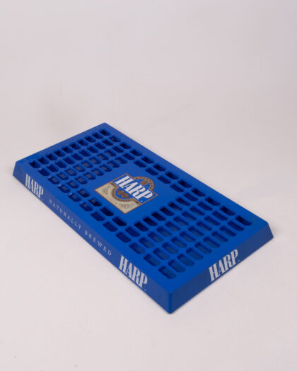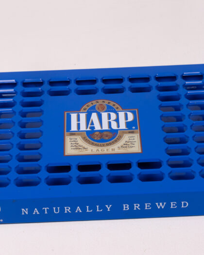 Vintage Harp Lager beer drip tray, featuring the Harp Lager logo and 'Naturally Brewed' slogan. Constructed from durable blue plastic with a slotted surface to collect drips. The tray is in good vintage condition, suitable for home bar use or as a breweriana collectible, adding a touch of retro Irish pub style.