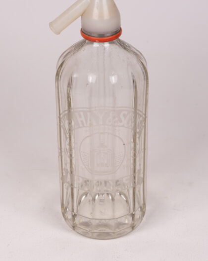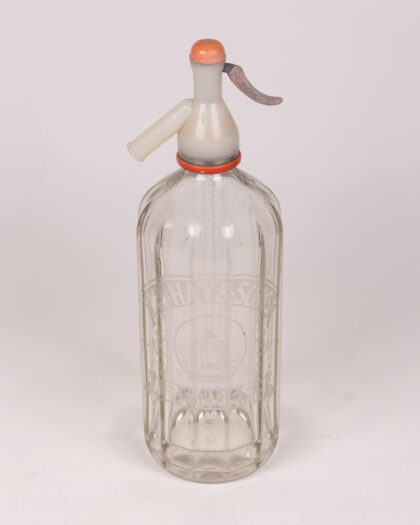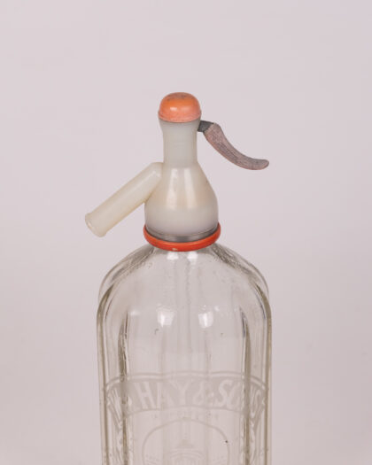 Vintage HAY & SONS glass soda siphon bottle from Aberdeen. Clear glass with orange and silver siphon mechanism. Good condition.