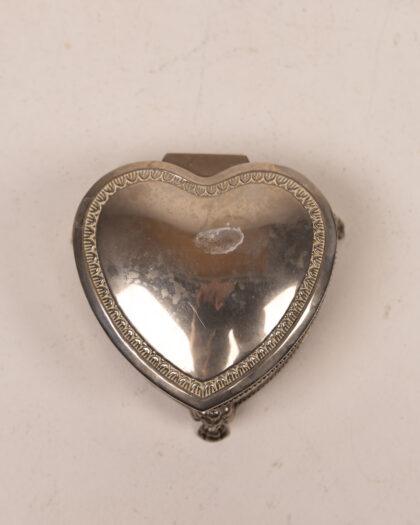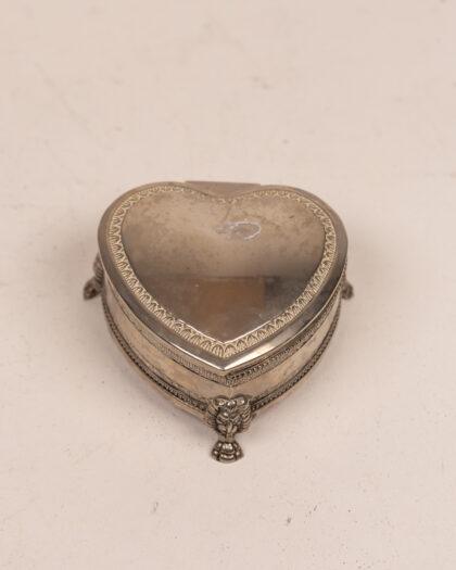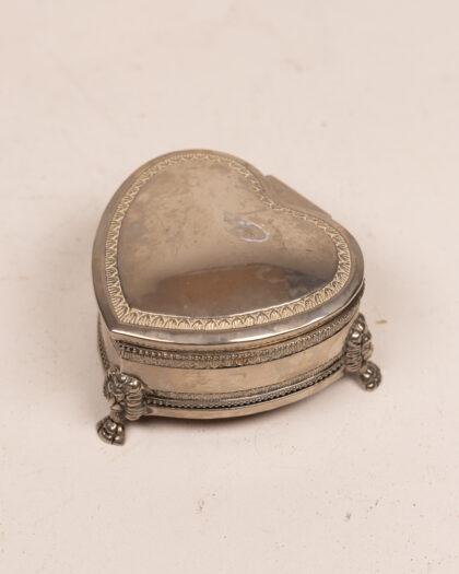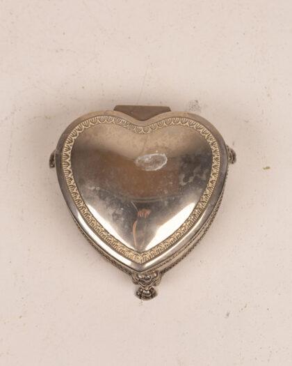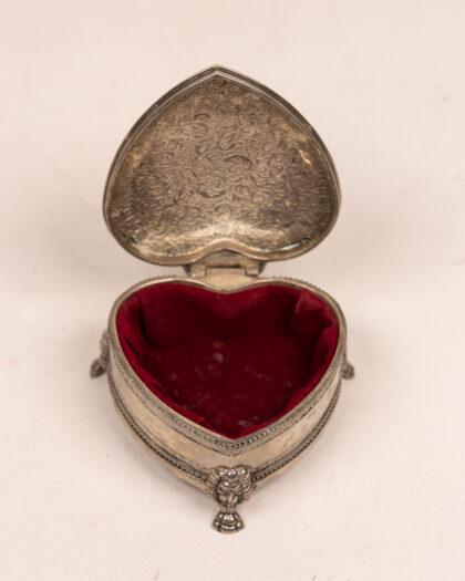A charming vintage heart-shaped trinket box with detailed silver craftsmanship.