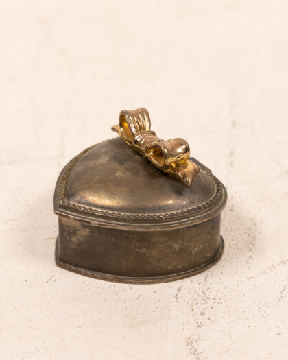 Vintage heart-shaped trinket box with golden bow detail and red velvet lining. Perfect for storing small treasures.