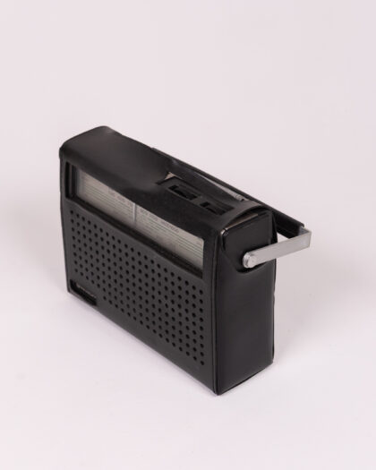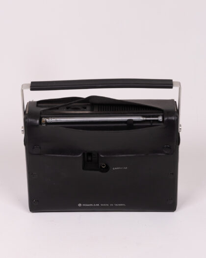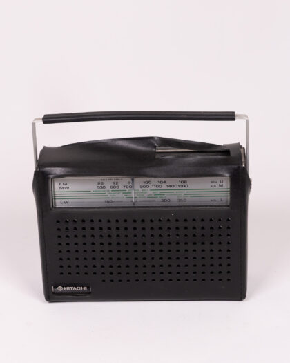 Vintage Hitachi portable radio with silver handle. Perfect for retro listening. Good condition.