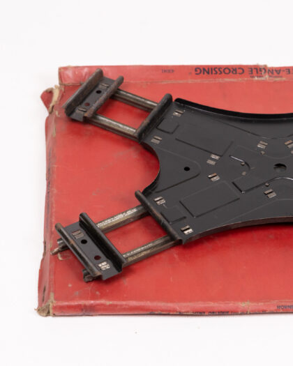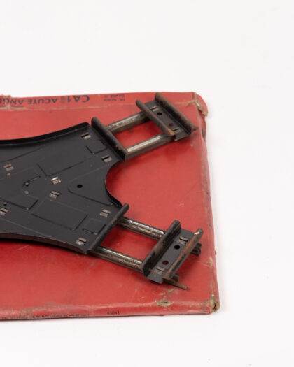 This is a vintage Hornby Series CA1 Acute-Angle Crossing. The crossing is made of metal and steel, and comes with its original box. The box is red with printed details. The crossing is primarily black and silver, and features the Hornby branding. It is in good condition for its age, though it shows some wear and tear on the box. This item would make a great addition to any collection of vintage toys or Hornby railway items.