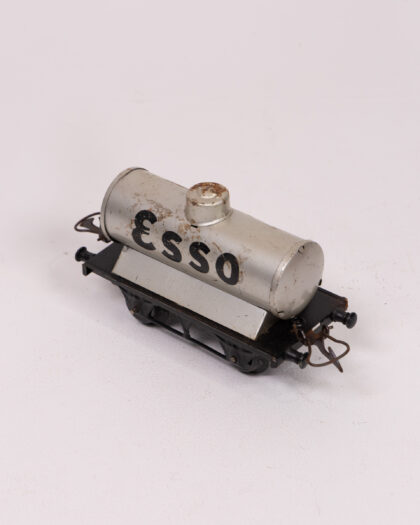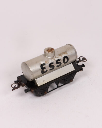 A vintage Hornby Trains O gauge petrol tanker wagon, branded for Esso. This model train car features a silver-painted metal tank with black 'Esso' lettering and a black undercarriage. Showing signs of age and use, with some paint loss and minor surface rust, it is overall in good condition. It is an ideal item for collectors of vintage model trains or petroliana.