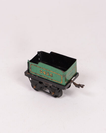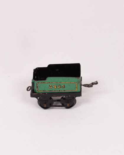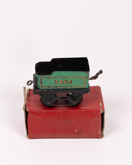 Vintage Hornby Trains M1 Tender with original box. Features a green body with gold lettering, black roof, and black wheels. The tender is marked with the number 3435. The original box is included. Shows some wear consistent with age and use.