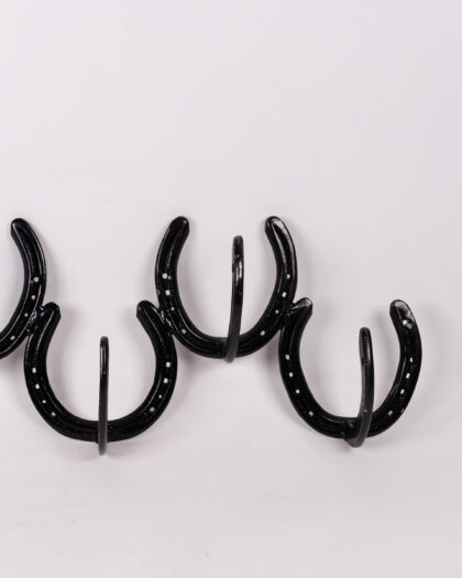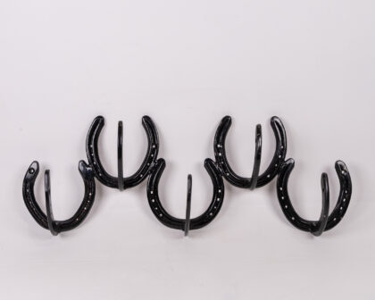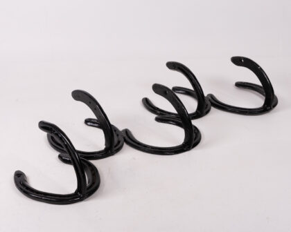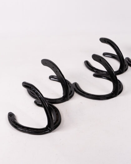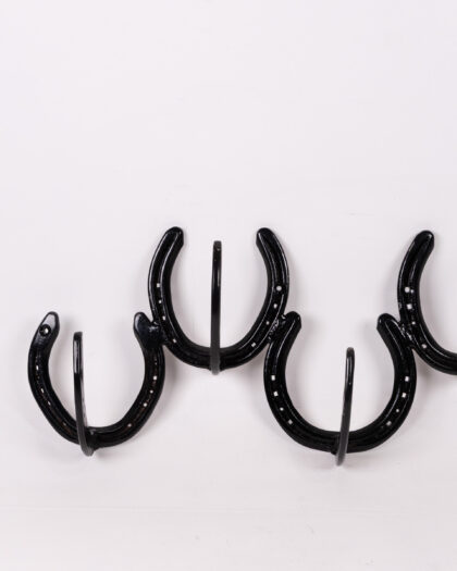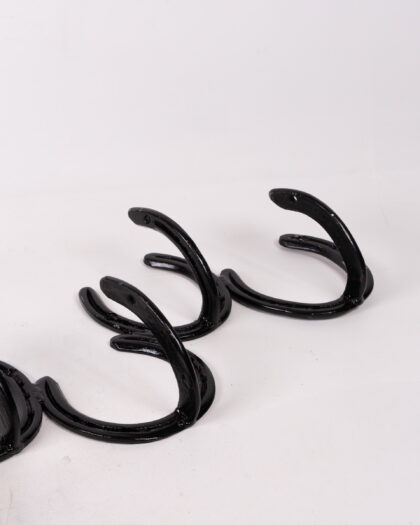 Unique vintage coat rack crafted from repurposed horseshoes. Sturdy metal construction with a charming rustic aesthetic. Ideal for adding character to any entryway.