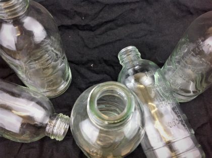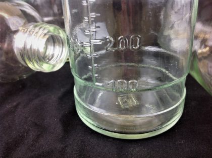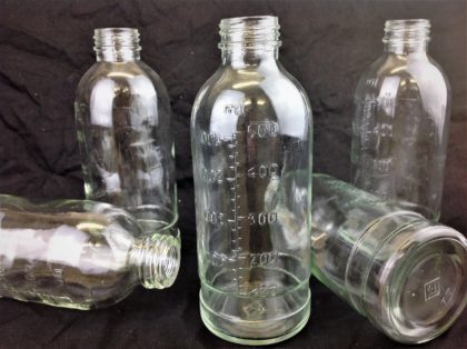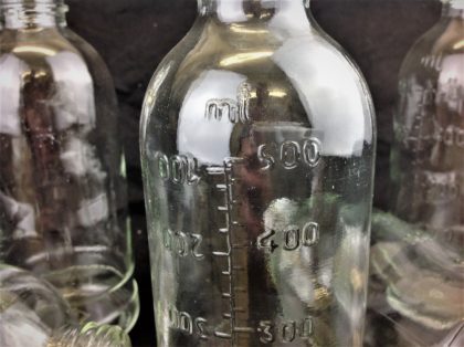 Strong glass bottle with millilitre increments 100ml to 500ml upright and upside-down, as per photographs.