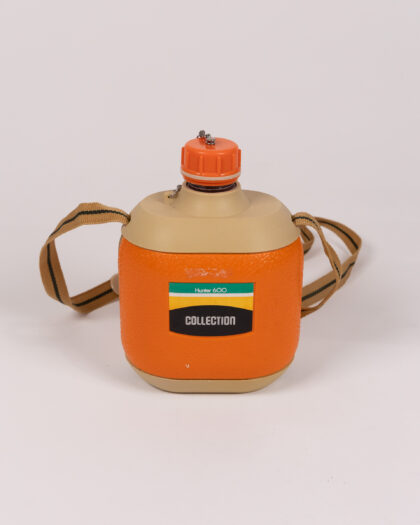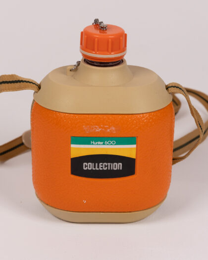Vintage 'Hunter 600 Collection' orange and beige canteen with brown strap and plastic stopper. Ideal for collectors and vintage enthusiasts.
