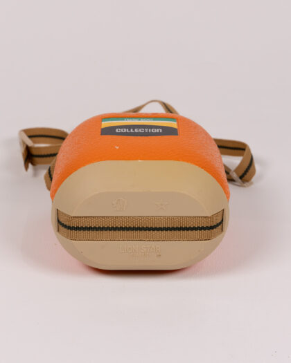 Vintage 'Hunter 600 Collection' canteen. This orange and beige canteen features a ridged texture on the orange section and a brown woven strap. The plastic stopper is secured with a chain. The base is marked 'Lion Star Plastics'. It's a great piece for collectors of vintage outdoor or camping gear. The item has some signs of age, with minor scuffs and wear, adding to its vintage charm. A practical and stylish vintage accessory.