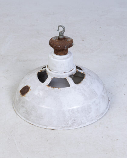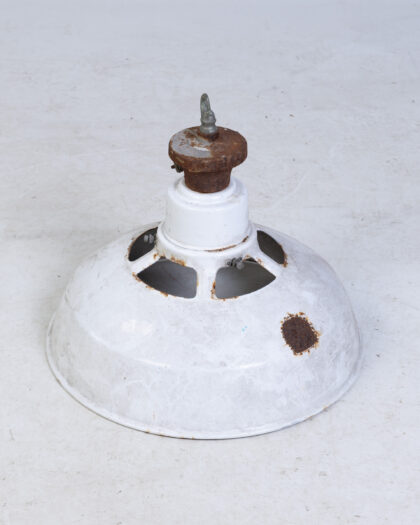Vintage white enamel industrial light fixture, showing some signs of wear with some rust, adding to its authentic charm. Unique piece!