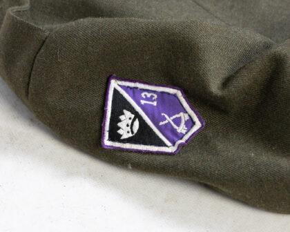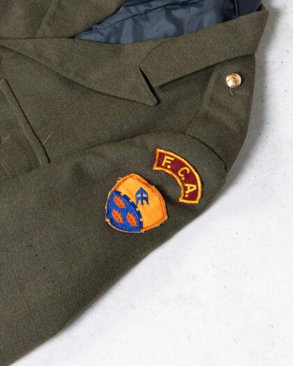 This is a vintage Irish Army uniform jacket in olive green. It features gold-colored buttons with a harp design. There are two breast pockets, two lower pockets, and shoulder patches on each arm. One patch is purple and black with a crown and cross symbol, and the other is orange and blue with 'F.C.A.' lettering. The jacket is lined with a blue fabric and marked as 'Made in Ireland.' Condition is good for its age, with some signs of wear but no major damage. A unique piece of Irish military history, ideal for collectors or historical reenactors.