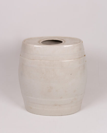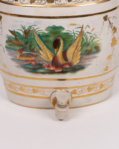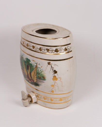 This is a vintage ceramic Irish Whiskey dispenser. It is decorated with a scene of swans on a lake and gold trim. It features a glass tap. The dispenser has a barrel-shaped design with a hole in the top for filling. There is some age related wear, but overall good condition. Perfect for kitchen, dining room or summer entertaining.