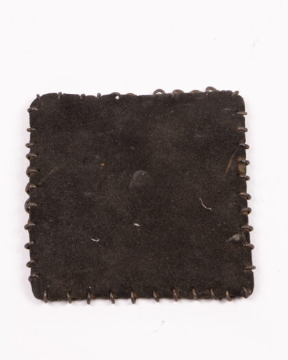This is a vintage coaster made of iron chainmail with a black suede backing. The chainmail is formed from small interlinked rings. It is in good condition for its age, with some minor wear to the suede. It could be used as a coaster or as an interesting decorative item.