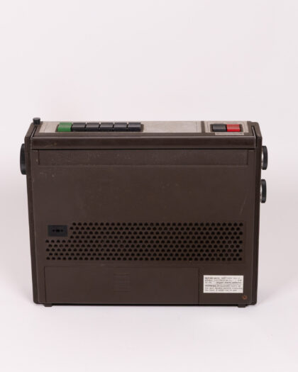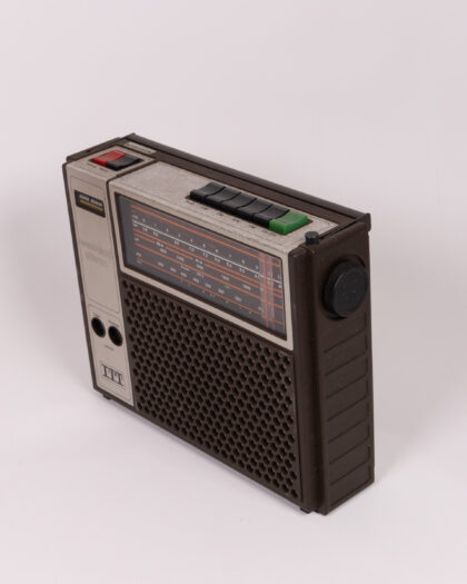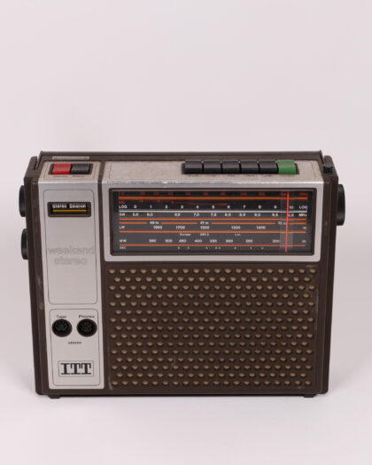 ITT Weekend Stereo radio with silver and brown plastic case. A push button radio, tape player and headphone jack. There are some marks and signs of wear to the plastic commensurate with age. The radio is untested. There is a battery cover on the back. It measures 23cm wide, 14cm high and 7cm deep.