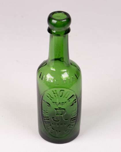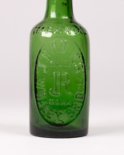 This is a vintage green glass bottle embossed with 'J. Rhodes, Wakefield'. It is a lovely shade of green with a smooth, rounded top and an oval body. It would make a great display item for a bar or living room shelf. It is in good condition for its age.