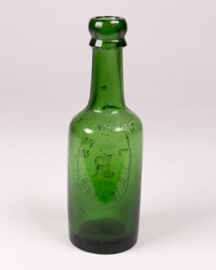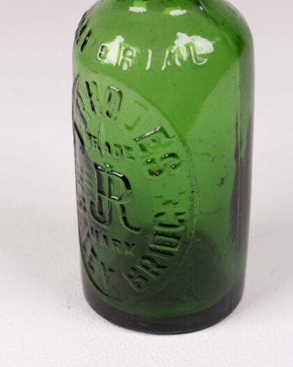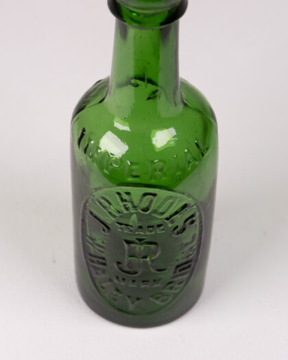 Vintage J. Rhodes Wakefield green glass bottle. Embossed detail on oval bottle. A great decorative piece for collectors.