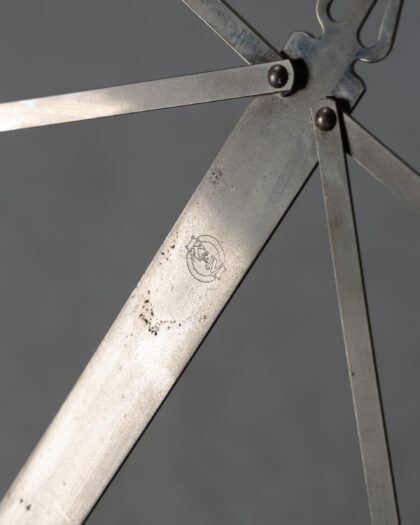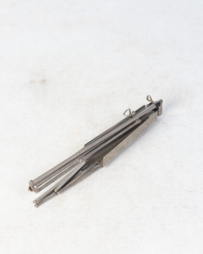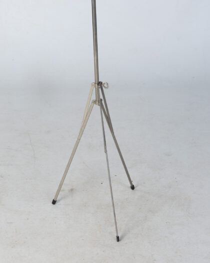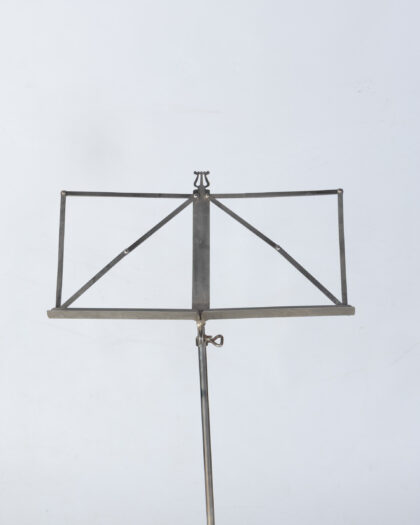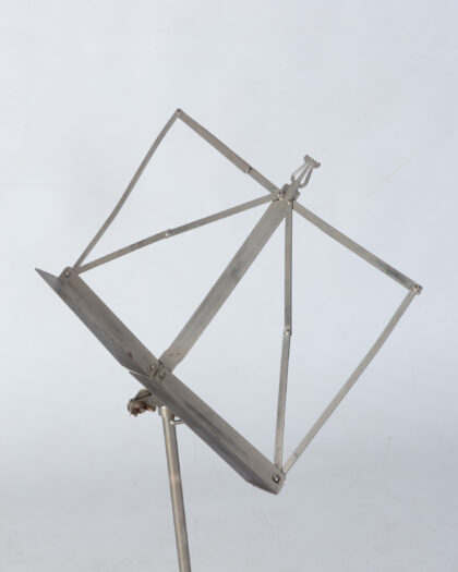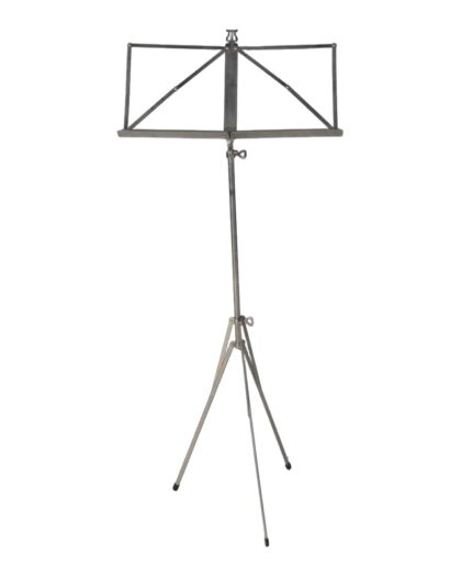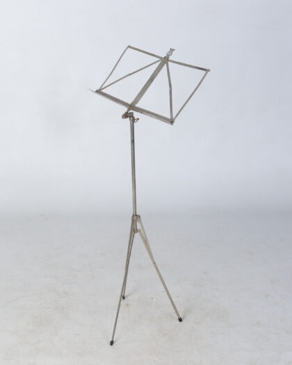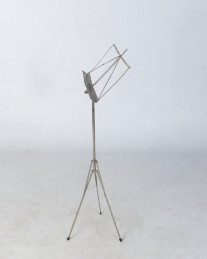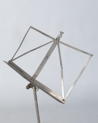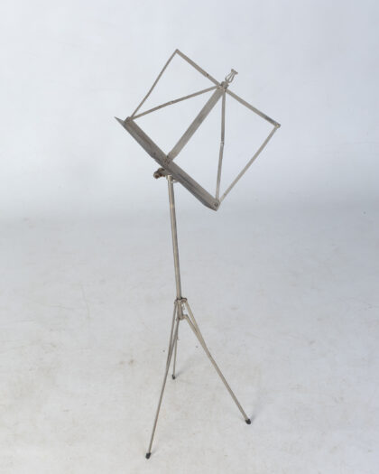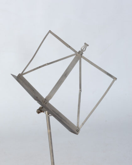 This is a vintage K & M music stand. It has a retractable tripod base and adjustable height and tilt. The stand is made from silver coloured steel and has a lyre shaped clip at the top for holding music in place. The stand folds away for storage and transportation. In good condition.