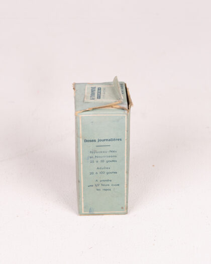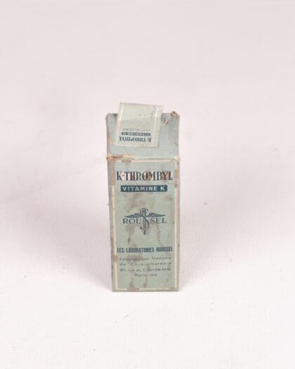 Vintage K-Thrombyl Vitamin K box from Roussel Laboratories. Light blue cardboard, worn condition. French text. Medical collectible.