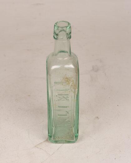 This is a vintage pale green glass bottle embossed with 'KIT' and, 'Coffee & Chicory'. The bottle has a rectangular shape with a short neck and rounded lip. The glass shows some minor surface wear consistent with age. A great addition to any vintage bottle collection.