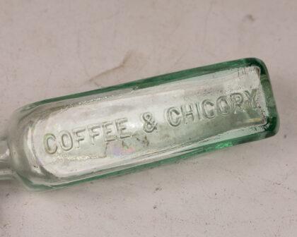 Vintage pale green glass bottle embossed with 'Coffee & Chicory'. Good condition, perfect for collectors.
