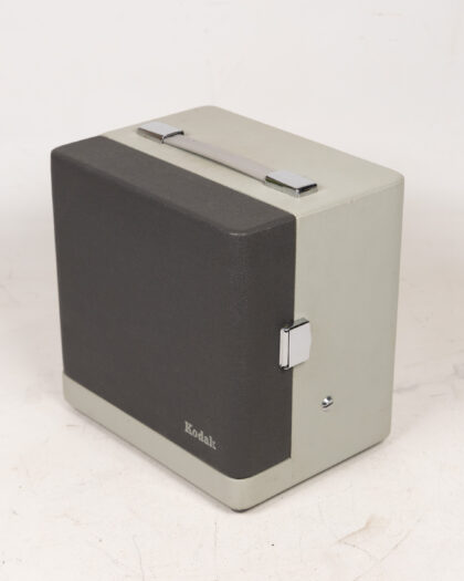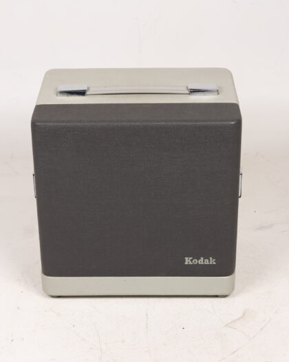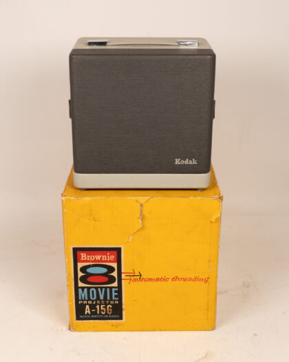 Vintage Kodak Brownie 8 Movie Projector A-15G in grey cabinet. Untested. Includes original box. Perfect for collectors or vintage tech enthusiasts.