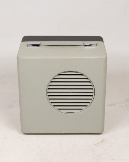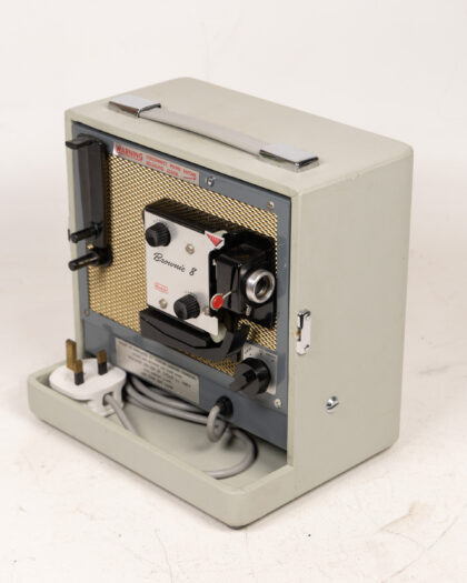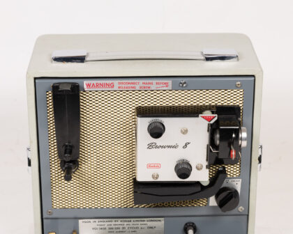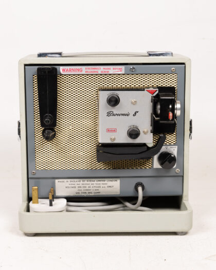 Vintage Kodak Brownie 8 Movie Projector, model A-15G. This projector comes in a grey and dark grey cabinet with a silver metal handle. Features include elevation and framing controls, a warning label to disconnect mains before releasing screws, and is labelled as "Made in England by Kodak Limited London". Voltage is 200-250 50 cycles a.c. only. It uses a Type DFC lamp. The projector is sold untested. The original box is included and shows some wear and tear. The box advertises automatic threading.