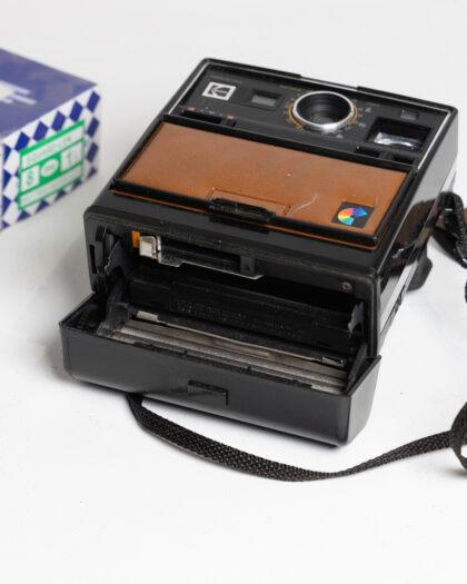 This vintage Kodak Brownie camera features a stylish leather front panel, adding a touch of elegance to its classic design. It boasts a simple focus control and light adjustment settings, making it a unique collectible piece for any photography enthusiast. The camera's condition appears good for its age, but please note: This item has not been tested, we cannot verify if it is working or not and is sold as a prop only. Perfect for display or as part of a vintage camera collection.