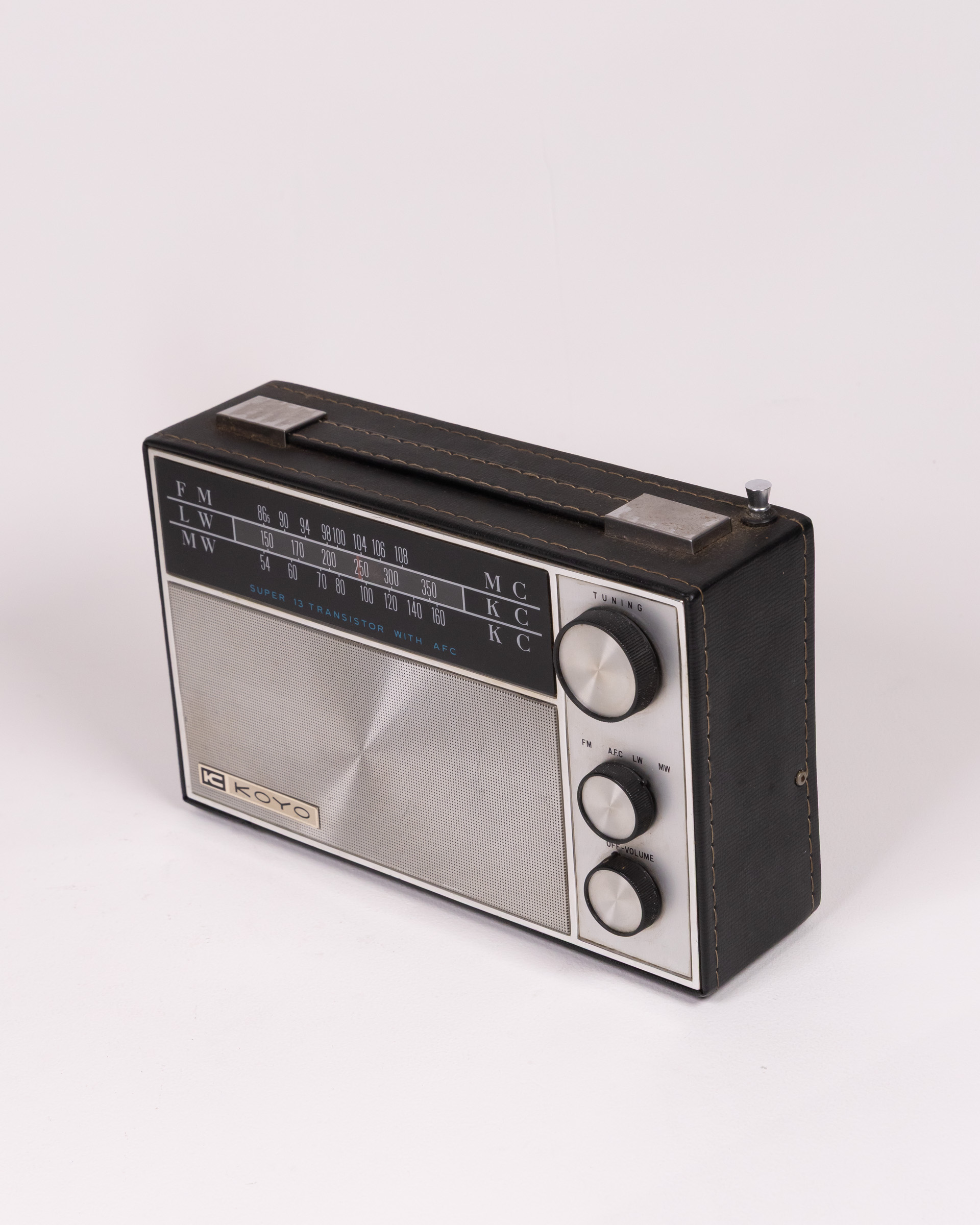 This is a Koyo Super 13 Transistor portable radio. The radio features FM, LW, and MW bands and has AFC (Automatic Frequency Control). The body of the radio is black with silver trim, a silver grill and metal knobs. There is a carry handle on the top. The back features several small holes, likely for speaker sound. It has two small ‘feet’. It is in vintage condition, with some wear and tear commensurate with age. Untested.
